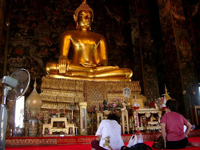 Ok, Jetlag in den Griff bekommen und uns nach dem Frühstück in das Stadtleben gestürzt. Ich sags euch, nachdem Trip bin ich der entspannste Mensch ever. Wir sind einfach los gelaufen. Ohne Plan und ohne Karte und haben schon nach 30 min den schönsten Tempel in Bangkok gefunden. War echt beeindruckend. Man geht durch ein Tor in einen großen Innenhof. Da stehen überall Buddhastatuen und dann in der großen Halle ein rießen Buddha aus gold. Sahsen bestimmt eine halbe Stunde in dem Meditationsraum und haben einfach nur die Statue und die ganze Wandmalerei und das ganze kitschige aber voll schöne Goldzeugs angeschaut. Dann ist mir auch gleich der größte fault pas des Tages passiert… Irgendwann konnte ich nicht mehr im Schneidersitz sitzen, weil sich in meiner Kniekehle von der Hitze schon ein See gebildet hat. Und dann habe ich meine Beine ausgestreckt und ich dummes Kind habe erst gestern gelesen, dass die Füße dass unreinste Körperteil sind und es unverschämt ist sie jemanden nackt hinzustecken. Toll. Ich habe Buddha beleidigt… Der Secrurityman hat mich aber zum Glück gleich drauf hin gewiesen… Na, ja das ganze würde erklären warum ich so ein scheiß Schicksal bekommen habe. Vor der Tempelhalle stand noch ein kleiner Altar an dem man Kerzen anzünden konnte oder Blumen spenden. Ich habe Räucherstäbchen angezündet :) und dann einen Becher mit Holzstäbchen geschüttelt, bis eines herraus gefallen ist auf den die Nummer 8 stand. Mit der Nummer bin ich dann zum Schicksalschrank in dem du dir in einem Fach mit der Nummer die rausgefallen ist einen Zettel mit deinem Schicksal abreisen kannst. Habe ein total tolles Schicksal bekommen…