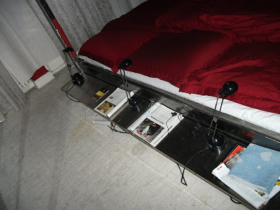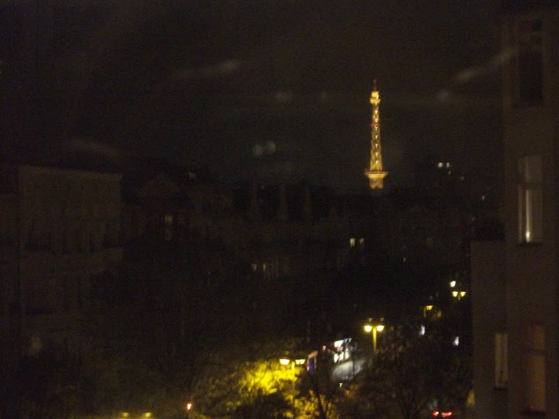 S-Bahnhof Charlottenburg. Lewishamstraße. Es besteht wieder die 50 zu 50 Chance die Straße in die richtige Richtung entlang zu gehen. Ich hatte wieder Pech und bin 2 km in die falsche Richtung gelaufen. Vorbei am Beate Uhse Shop und dem Erotik Point Erdbeermund bis ich endlich eine Straße überquert habe die auf meinem Stadtplan angegeben war und mir zeigte, dass ich komplett falsch bin. Scheisse. Also wieder zurück und vorbei an Beate Uhse und dem Erdbeermund. Ich dachte Charlottenburg ist schicky-micky. Kommt mir hier gerade nicht so vor und es ist gar nicht so einfach über die Blätter auf der Straße zu rollen, die sich alle unter dem Koffer zu Bergen ansammeln. 12 Minuten später habe ich mein Ziel erreicht, den Aufzug gefunden und stand im 3. Stock vor der Tür. Heinrich hat mich nett empfangen und gleich die Wohnungsführung mit mir durchgeführt. Als erstes gingen wir ins „Turmzimmer“ mit Blick auf den beleuchteten Fernsehturm, schweren Samtvorhängen am Fenster und einen kuschelweichen Teppich. Weiter ging es ins Arbeitszimmer. Jetzt kam auch Mo dazu, eine hübsche junge Frau. Mitbewohnerin? Freundin? Tochter? Es ging weiter ins Badezimmer und dem hauseigenem Fotostudio. Sehr beeindruckend was sich hier so alles von Technik bis Requisite angesammelt hat. Zum Schluss landen wir in der gemütlichen Küche wo Mo schon den Backofen für das Essen angemacht hat.