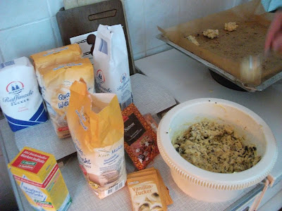 Meine Buchpremiere stand vor der Tür. Es sollte nicht nur ein bisschen gefeiert werden, dass man jetzt offiziell das Buch im Laden kaufen kann, sondern es sollte auch ein kleines Dankeschön für die Gastgeber sein, ohne die das alles nicht zu Stande gekommen wäre. Also habe ich mir eine kleine Goodybag überlegt. Ein Jutebeutel auf dem handbeschriftet „90 Nächte“ steht, in dem das Buch rein kommt und eine Tüte voller Cookies, die ich mit Liebe selbst backen wollte und auch gemacht habe. Nur zeitlich habe ich mich etwas verschätzt und gerechnet habe ich vorher auch nicht. Wenn nämlich 50 zugesagte Gäste kommen und jeder 5 Cookies in seiner Tüte hat, brauche ich 250 Kekse. Auf einem Blech gehen ca. 10 und sie brauchen 15 Minuten. Um die 250 Cookies zu produzieren brauche ich zwischen 6 und 7 Stunden plus Vorbereitung und Teig anrühren 8 Stunden plus 2 Stunden Jutebeutel beschriften macht 10 Stunden. Ich war leicht fertig danach! Aber es hat sich gelohnt! Ich glaube der eine oder andere hat sich gefreut und es lagen nach der Lesung ganz viele leere Brotzeittüten rum :)