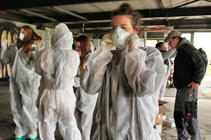 Die Canon 1200D ist übrigens eine echte Einsteigerkamera, für alle, die Blut geleckt haben und es selber einmal ausprobieren möchten. Dazu gibt es ja genügend Tipps und Tricks in der App, die nebenbei auf dem Smartphone oder dem Tablet laufen kann und die euch wirklich alles im Detail erklärt. Nachdem wir die Location unsicher gemacht haben und die Fotos im Kasten hatten, ging es an eine zweite Herausforderung: das erste Mal Graffiti sprühen. Ich hatte da ja schon so einige Versuche im Keller unter meiner Wohnung, die ich damals übrigens unglaublich gut fand, aber so wirklich kann ich es nicht. Nein, eigentlich gar nicht. Damit wir richtig schön aussehen, haben wir uns alle in lustige Overalls gesteckt und drauf losgesprüht. Die ganzen Gebäude, die sich um und auf dem Teufelsberg in Berlin befinden sind von oben bis unten vollgesprüht mit Graffiti und das gehört auch so. Wo also, wenn nicht hier, sollte man die hohe Kunst des Graffiti sprühens lernen? Seht selbst!