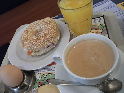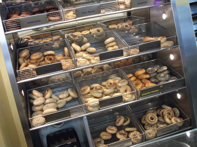 Es ging zum Frühstück zu den Bagel Brothers. Ich war überwältigt von der Vielfalt. Frühstücksangebote mit frischen O-Saft und gekochtem Ei. Herzhafte Varianten mit Hacksteak oder süße Bagels mit Honig, Apfel und Ziegenkäse. Nicht zu verachten die Süßwarentheke und die frisch gepressten Säfte. Ich stand erst einmal 10 Minuten da und habe überlegt und überlegt und in meinen Bauch gehört, was der jetzt gerne verdauen möchte. Dann wurde es das Activ Day Frühstück. Auf einem kleinen Tablett habe ich mein Frühstück bestehend aus Lachs-Bagel, Ei, Kaffee und O-Saft zum Tisch balanciert. Es war gut und nahrhaft. Leider habe ich vergessen mit den Bagel etwas warm machen zu lassen. Dann wäre es noch besser gewesen. Einen Umweg von ca. 30km ist es zwar nicht wert, schon allein der Umwelt zu liebe, aber wenn man sowieso in Leipzig ist, kann ich nur sagen: Auf, auf zu den Bagel Brothers und lecker schlemmen.