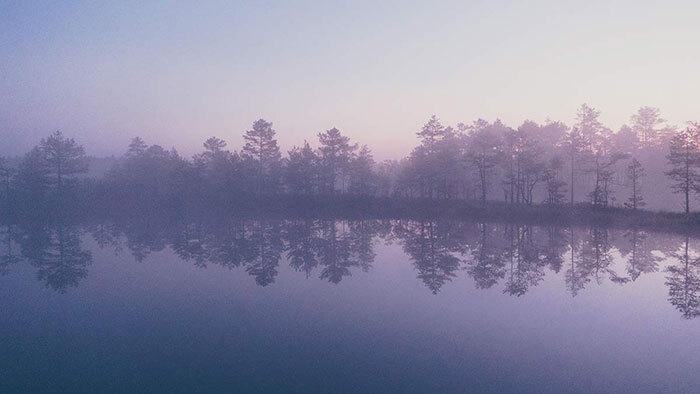 Während die ersten warmen Sonnenstrahlen den Tau zum Funkeln bringen und der Dunst sich langsam über die stillen Seen zieht, könnte man fast meinen, dass das hier das Land der Feen und Einhörner ist. Aber vielleicht ist das auch nur meine Fantasie. Dichte Wälder ziehen sich hier am Rande der Sümpfe entlang und der Himmel darüber trägt noch blau-violette Farben. Auf den spiegelglatten Gewässern zeichnen sich glasklare Ebenbilder der mich umringenden Kiefernwälder ab.