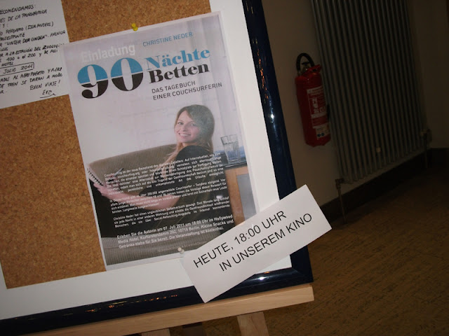 Ich sitze wieder fröhlich aber nicht mehr ganz so frisch auf der Arbeit. Gegen Mittag machte sich dann eine leichte Nervosität in mir breit. Ich hatte noch eine Lesung, die echt der Knaller war. Im Hollywood Hotel im Kinosaal durfte ich vor der Leinwand Platz nehmen und aus meinem Buch „90 Nächte, 90 Betten“ lesen. Das Publikum war klasse, um 20 Uhr war schon wieder alles vorbei und ich musste schnell nach Hause, um mir das kleine Schwarze überzustreifen.
