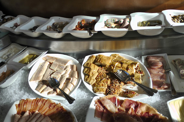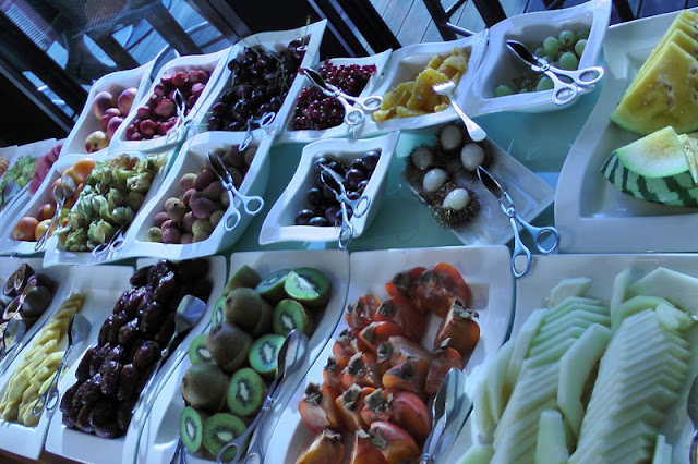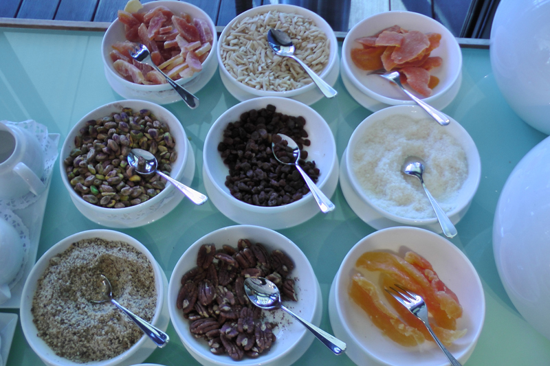 Es war ein 5 Sterne Hotel. Es war traumhaft schön. Nachts haben wir auf der Dachterasse auf dem Beduinensofa noch einen Wein getrunken, bevor ich mich auf die eine Seite des Doppelbettes kuscheln durfte und morgens gab es auf der gleichen Dachterrasse Frühstück. Frühstück mit 20 verschiedenen Obstsorten, von denen ich fünf noch nie in meinem Leben gesehen haben. 15 verschiedenen Marmeladen, eine Unmenge an verschiedenen Brot- und Brötchensorten aber das aller, aller geilste. Der Ausblick auf die Berge. Es war so schön, dass ich absolut vergessen habe, dass ich immer noch das gleiche Kleid anhatte, das ich den ganzen Abend trug und ungeschminkt mit zerzausten Haaren zwischen allen Stylos saß und an meinen Früchten knabberte. Dass nenne ich Entspannung. Vergessen wie man aussieht.