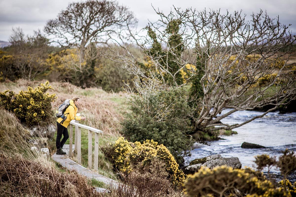 Auf idyllischen, saftig grünen Wiesenpfaden folgen wir dem Wasserlauf und queren regelmäßig über Leitern oder Holzstiegen die vielen Weidegartenzäune. Gelbblühende Ginsterbüsche sorgen für wunderschöne Farbakzente am Wegesrand. Angler grüßen uns freundlich und Schafe sind zu sehen – so weit das Auge reicht! Es sind unglaublich gutmütige und liebenswerte Tiere, auch wenn man in ihrem Terrain umher spaziert.