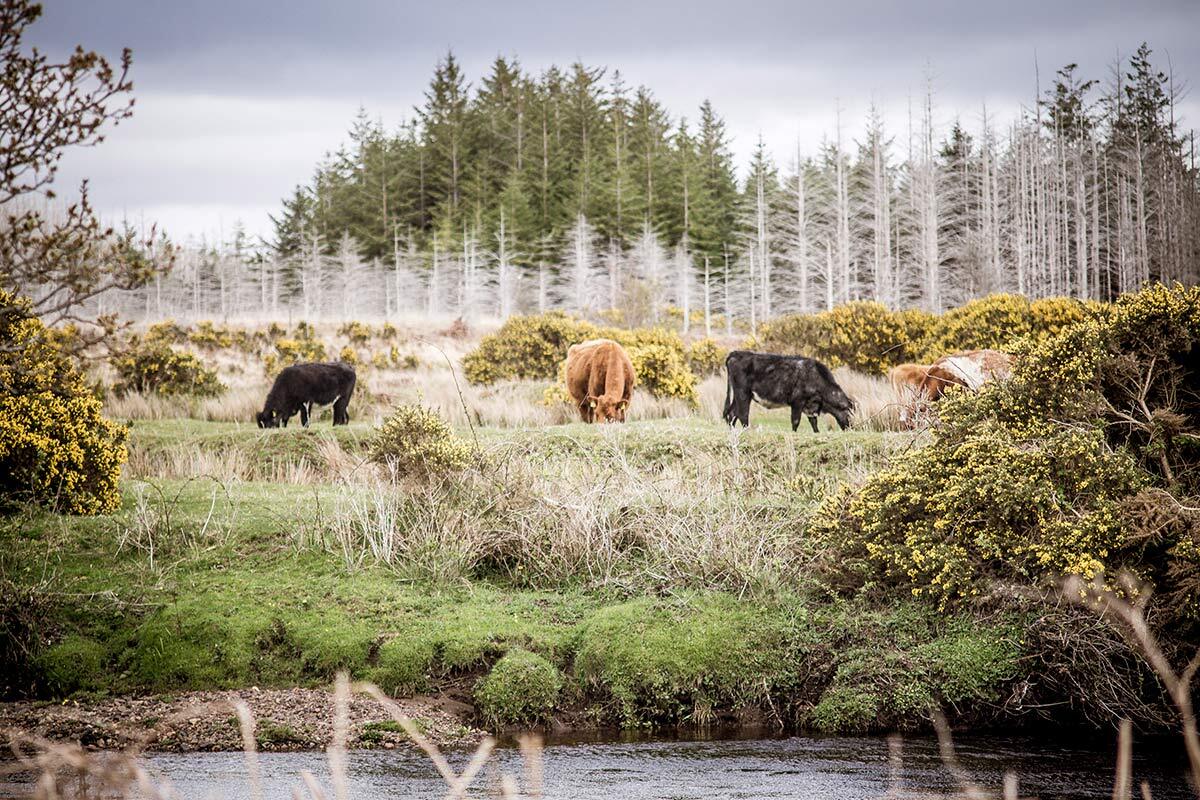 Der ruhige, einsame Ort, bestehend aus Bachlauf und umgeben von hügeligen, grünen Wiesen, liegt wie eine Oase in der sonst vorherrschenden moorbraunen Landschaft.