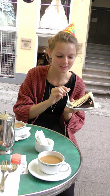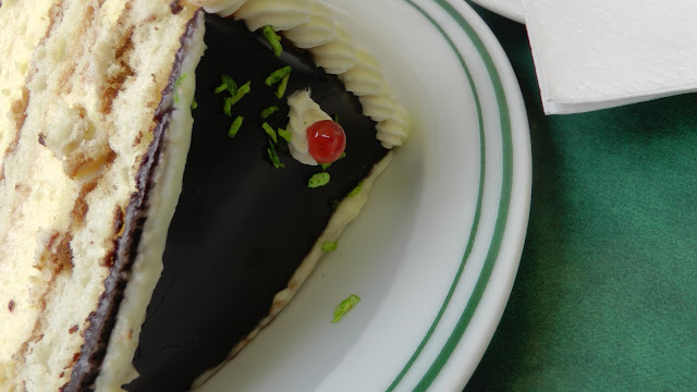 Und da habe ich ihn bekommen, meinen Geburtstagskuchen. Ein Teig mit viel Schokolade und Sahne. Mit Kaffee für schlappe 13 Euro ABER wenn man Geburtstag hat, darf man sich das gönnen. :)