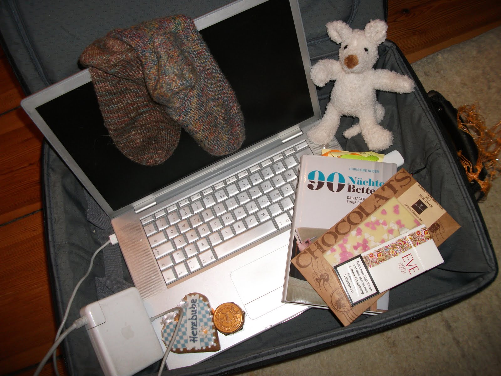 … ganz klar, meinen Laptop, da der irgendwie mein Leben ist und mein Leben in sich hat, Fotos, Texte, Musik, Erinnerungen. Den Surf-Stick nehme ich aus sicherheitshalber mal mit. Man weiß ja nicht ob es da oben oder unten W-Lan gibt.