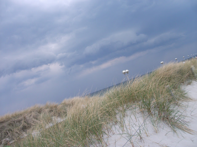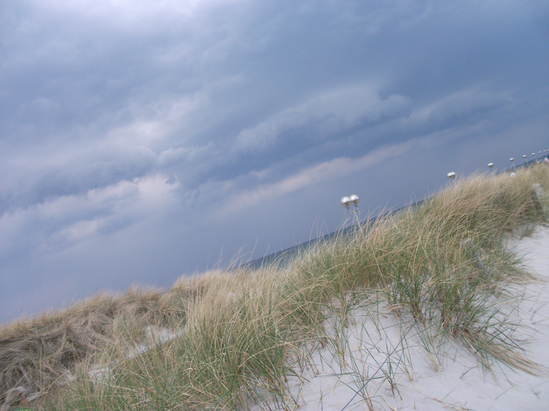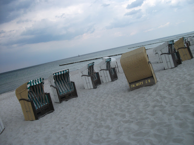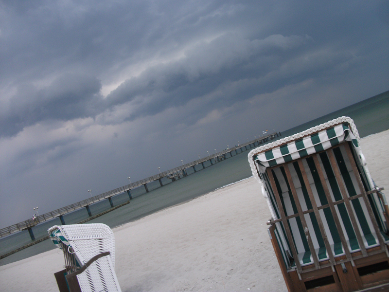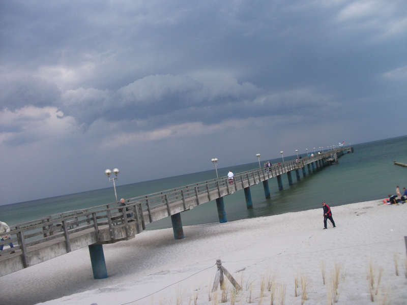 Wir machen als Erstes einen Ausflug, wie man sich einen typischen Ausflug an der Ostsee vorstellt. Wir schwingen uns auf die stählernen Pferde, fahren die 7,2 km auf einem Damenrad zum Strand, um erst einmal in einem Strandrestaurant mit gläsernen Windschutz und billigen Plastiktischen einen Seelachs mit Pellkartoffeln zu essen und anschließend einen romantischen Spaziergang am Strand zu machen. Wie man das kennt. Barfuss, mit den Schuhen in der Hand, und so. Der Sparziergang dauerte nicht sehr lange und eine bedrohliche Wolke zerstörte die Idylle. Wir konnten plötzlich nicht mehr das gemütliche Leben eines Rentners führen, die uns durch ihre Überzahl in der Anwesenheit inspiriert haben. Wir mussten in strömenden Regen eine sportliche Höchstleistung erbringen um im Gewitter nach Hause zu kommen und nicht vom Blitz getroffen zu werden. Zu Hause (eigentlich interessant was man alles als zu Hause benennt, obwohl man nur 10 Minuten da war um seine Koffer abzustellen), wartete dann ein Fläschchen Cremant im Kühlschrank, der herrlich von innen wärmte und ein Fernseher, mit dem man den Eurovision Song-Contest anschauen konnte. Nach der sportlichen Leistung von 14,4 km auf dem Fahrrad mit ordentlich Übergewicht, da alle Klamotten 5 Kilo schwerer wurde durch den Regen und teilweise auch Hagel eine schwer verdiente Leistung!