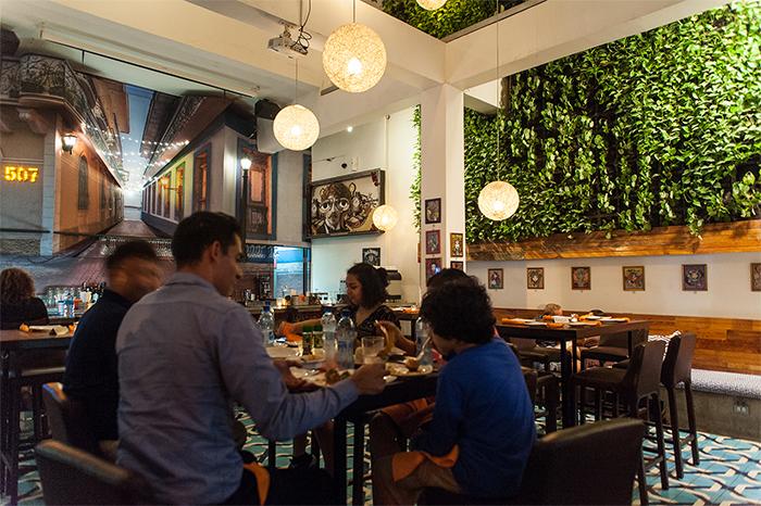 Stylisches Interieur im Restaurant des Hotel Tántalo, inklusive echter Pflanzenwand