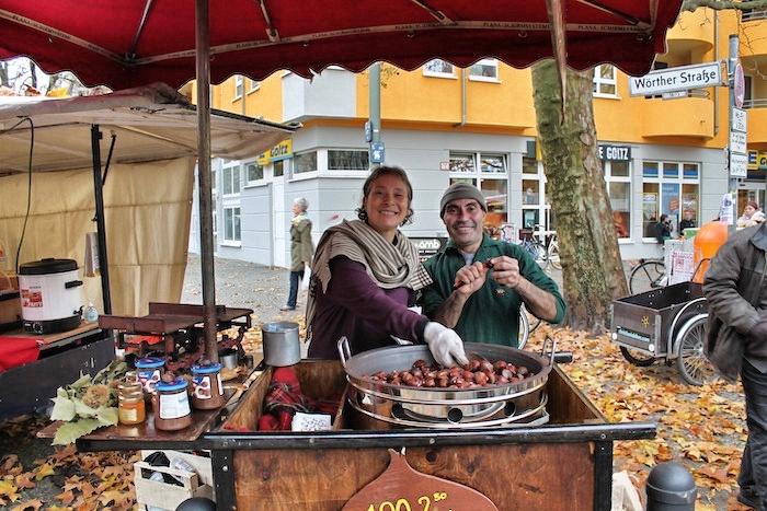Für mich ist ein Wochenende ein gutes Wochenende, wenn der Samstagmorgen auf dem Markt am Kollwitzplatz beginnt. Das Mittagessen wird ausgelassen und einfach auf den Markt verlegt. Ihr könnt zum Beispiel am Eingang des Wochenmarkts beim Bergkäse anfangen, dazu noch ein Glas Wein am Stand von Wein- und Sektgut Braun bestellen und das bunte Treiben genießen. Oder es mir nachmachen und euch von Stand zu Stand essen. Ich fange meistens bei den Falafelbällchen an. Den Marktstand betreibt der Inhaber von 1001 Fallafel aus der Stargarder Straße den wir auch weiter unten im Blogpost vorstellen. Er ist laut, lustig und hat das Marktschreier-Gen. Danach hole ich mir bei den netten Italienern eine Tüte voll mit Röstkastanien und schaue den anderen Marktbesuchern zu, wie sie gemeinsam ihre Zeit verbringen. Anschließend habe ich natürlich Lust auf Süßes und stelle mich beim Stand mit glutenfreien Tiramisu oder dem dem Berliner Crepes an.