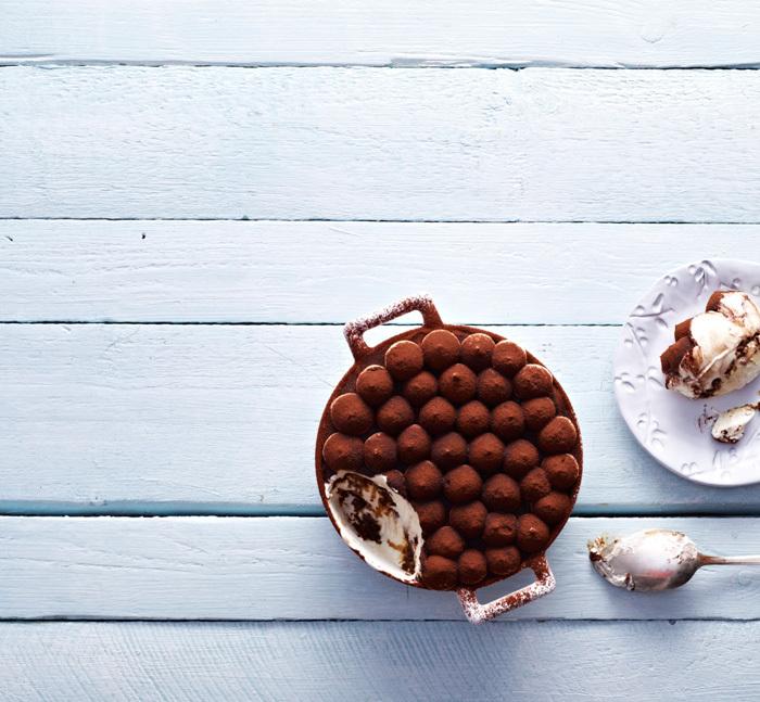 Die übrige Creme in einen Spritzbeutel mit Lochtülle füllen und damit Tupfen auf die Oberfläche spritzen. Mit Kakaopulver bestäuben und am besten für 1 Tag kalt stellen.