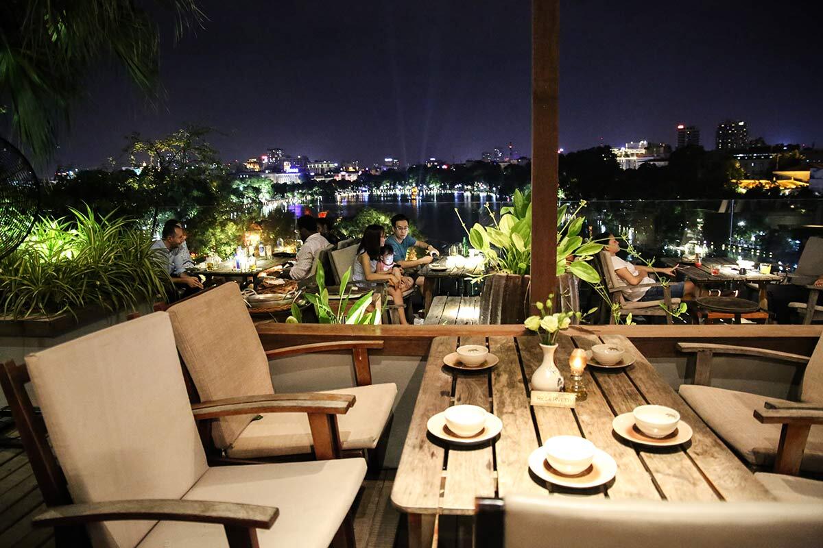 Mitten in der Stadt erstrahlt der Hoan-Kiem-See in bunten Farben, wie man hier von der Terrasse des Cau Go Restaurants sehen kann.