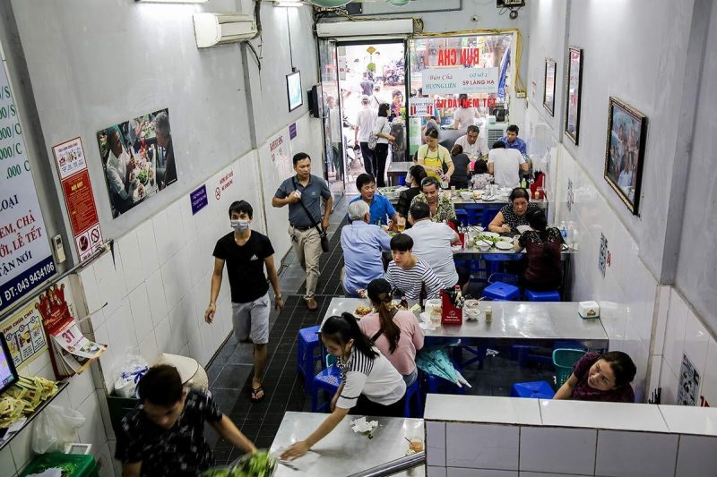 Volle Tische im Bun Cha Huong Lien Restaurant in Hanoi