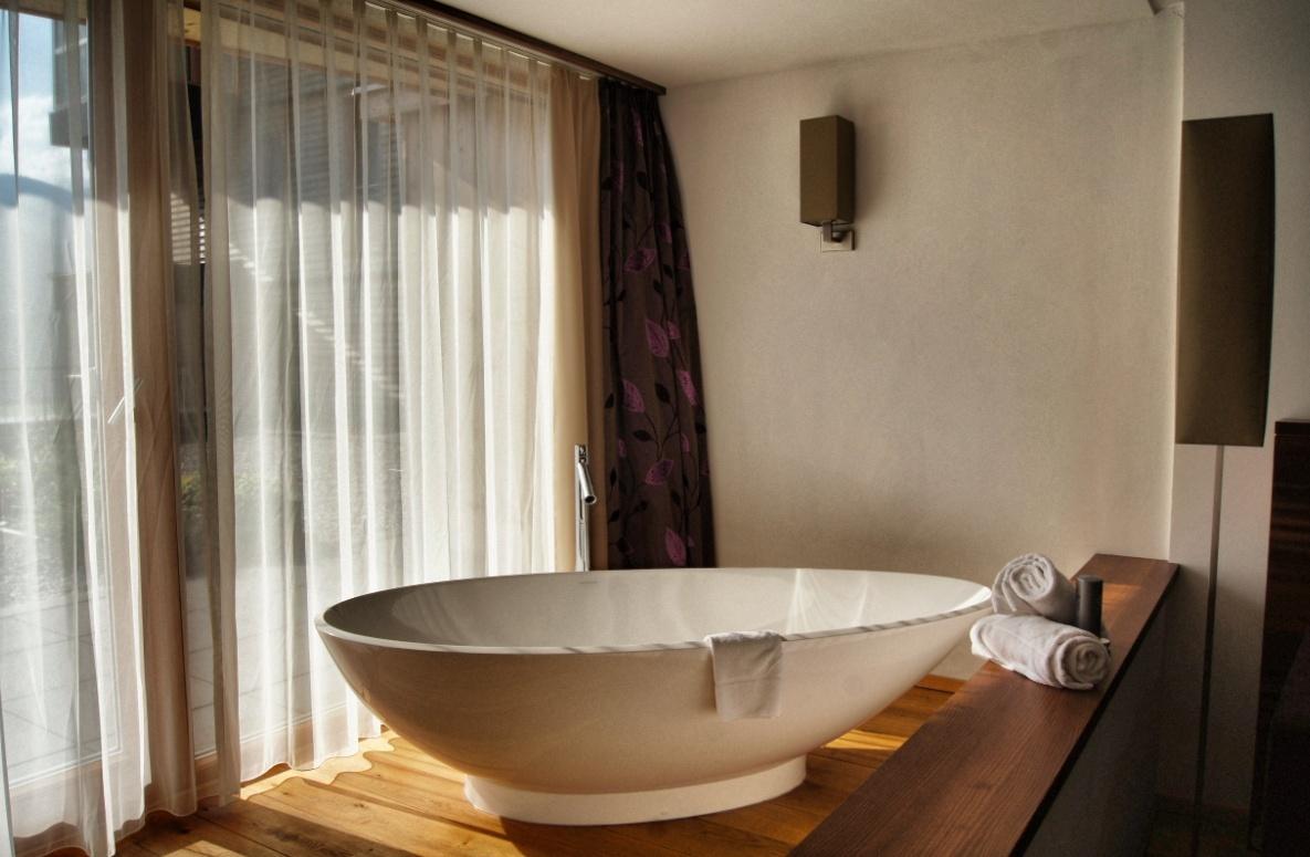 Ich muss noch einmal kurz zum Zimmer zurück kommen. Die Badewanne hat mich wirklich umgehauen. Also wer auf Badewannen steht, der hat hier im Kronthaler den Checkpot gezogen. Ich lege eher Wert auf die Dusche und da gibt es für mich nichts schöneres als einen Platzregen aus einer großen Regenwalddusche mit 30 cm Durchmesser. Was ich auch einmal gesehen habe, im Gradonna in Osttirol, eine Infrarotkabine im Zimmer mit Blick auf die Berge. Auch toll!