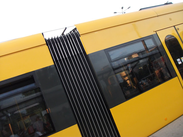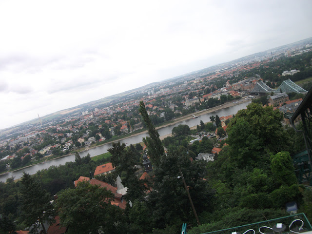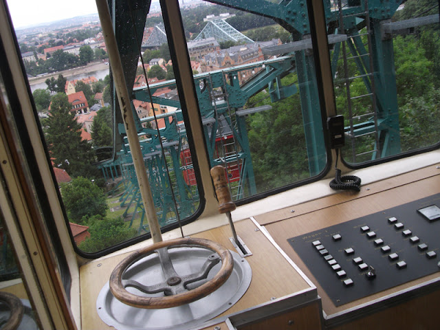 Dieser rote Waggon bringt uns über die Dächer von Dresden.